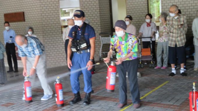 消防士さんに消火器の使い方を教えていただきました。 みんなで力を合わせて防火に努めます。
