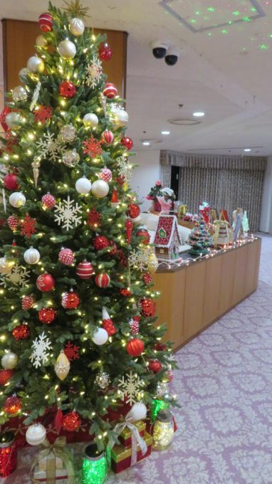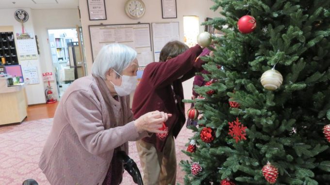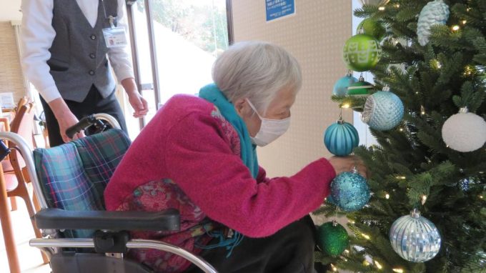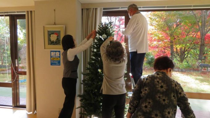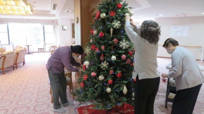 京都ヴィラでは毎年恒例 ロビーでご入居者と一緒にツリーの飾りつけ作業をしました。